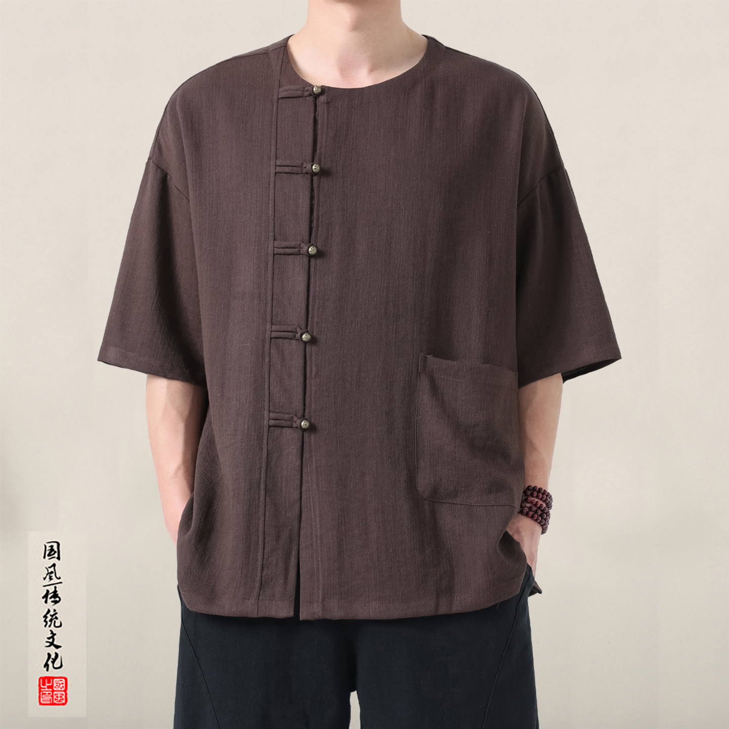中国风男装夏季复古风棉麻T恤短袖男士套装上衣V领中式汉服七分袖
