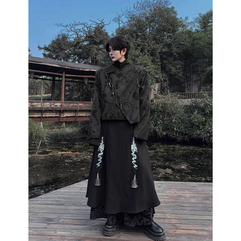 SANBAI 叁佰新中式国风唐装衬衫男装春季黑色订婚外套长袖上衣