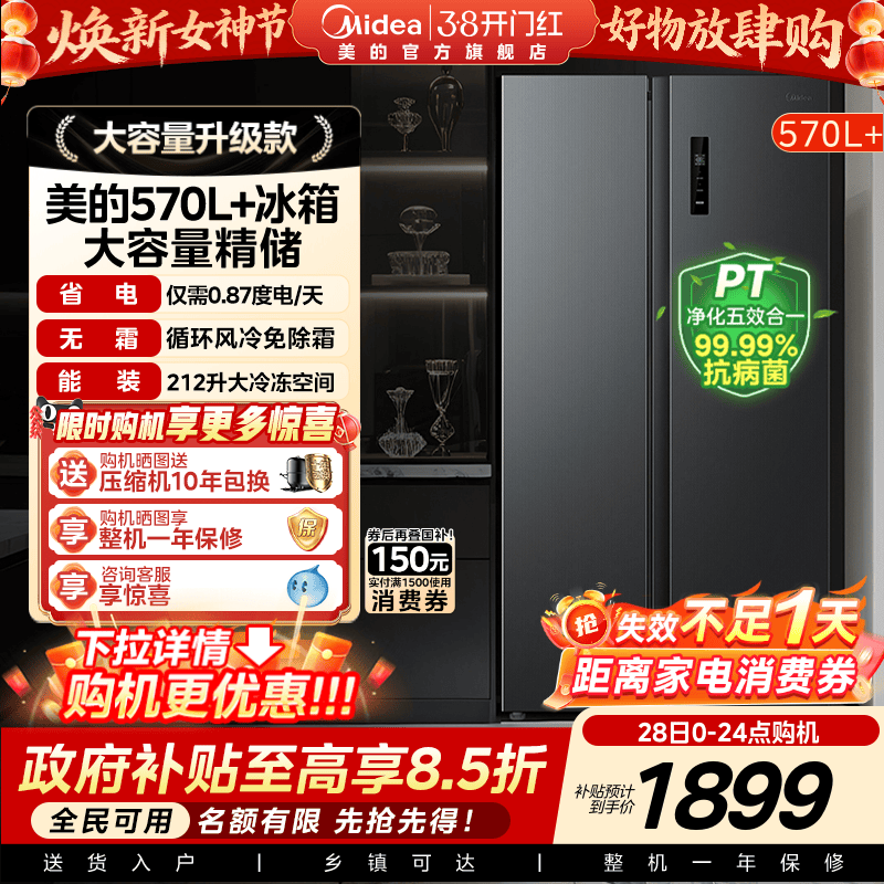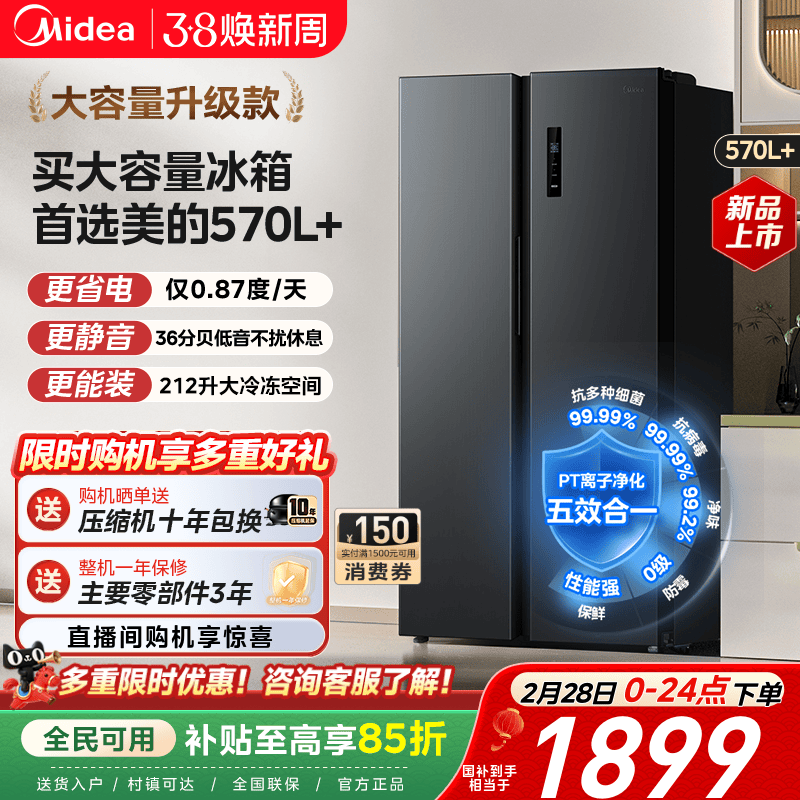 美的570L+对开双开门两门大容量家用冰箱一级节能风冷无霜超薄