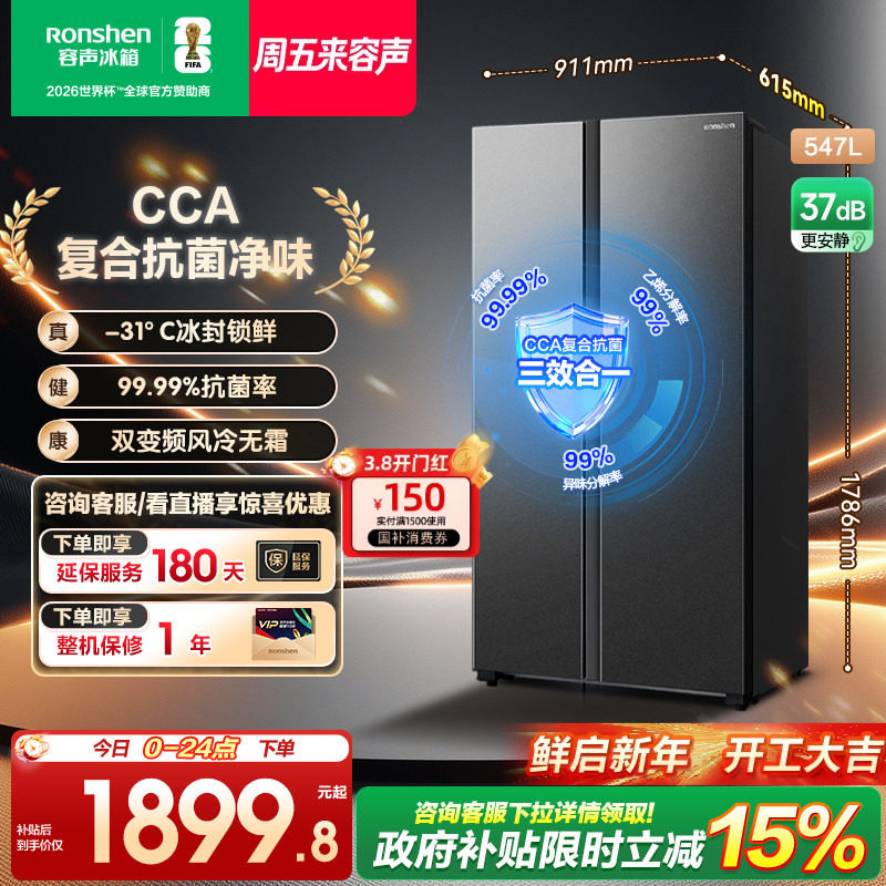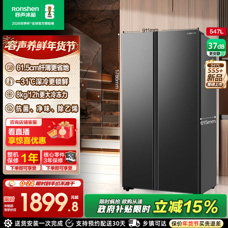 容声547L对开双开门大容量一级能效风冷无霜超薄家用冰箱换新补贴