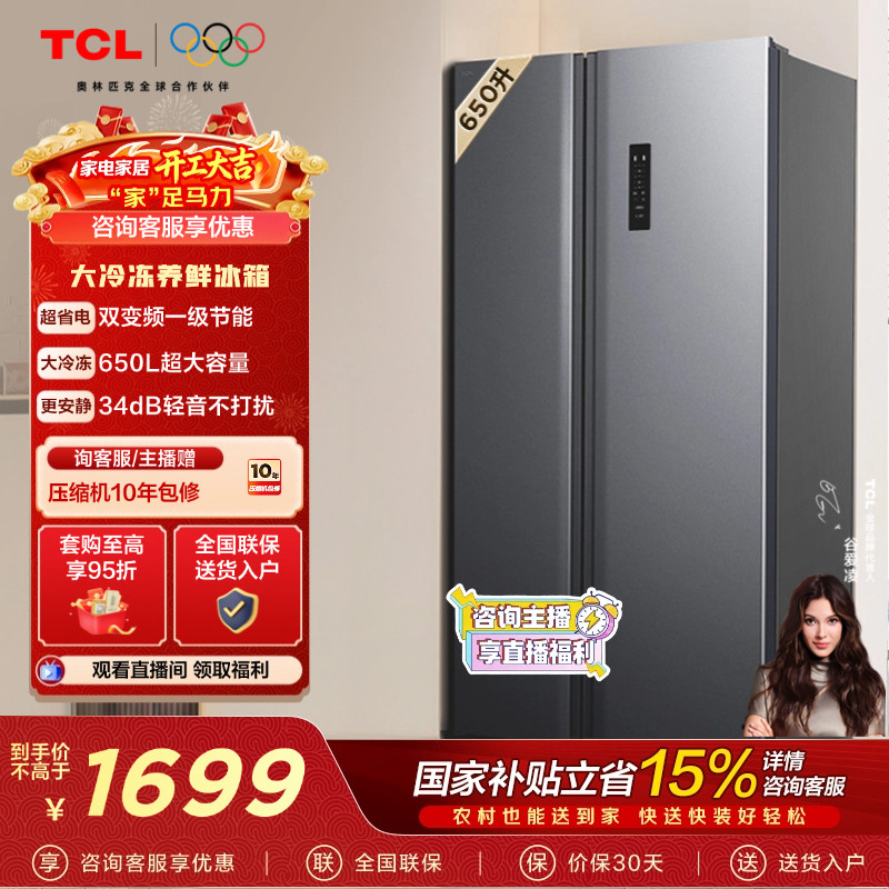 TCL 650升对开门双开门大容量大冷冻冰箱 一级能效 风冷无霜变频