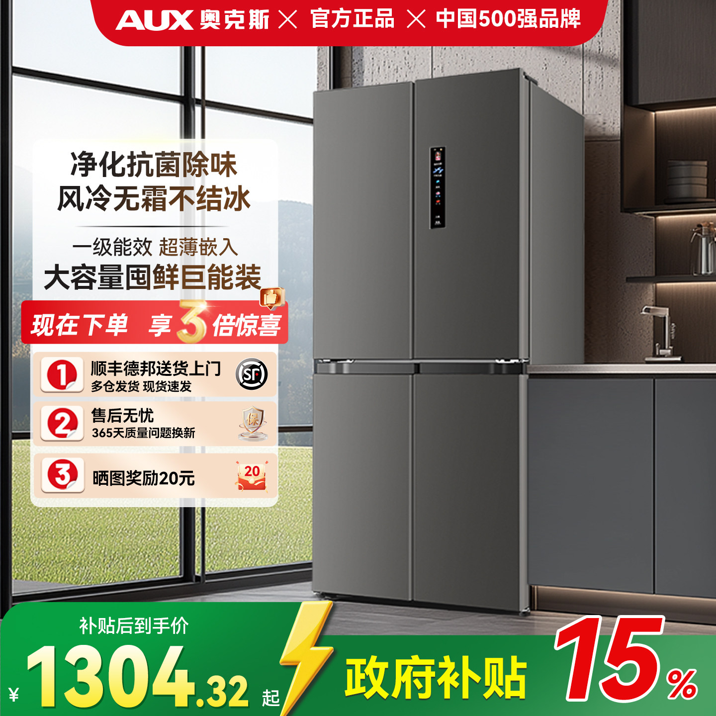 奥克斯十字对开门家用冰箱大容量双开门风冷无霜一级超薄嵌入租房