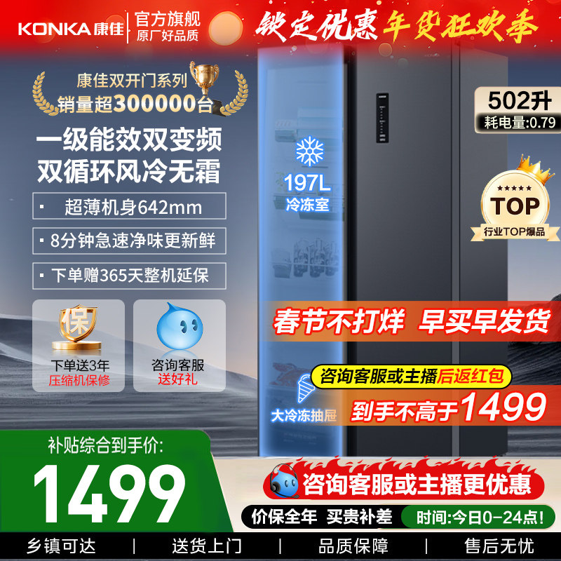 康佳502L对开双开门冰箱一级节能变频风冷家用大容量超薄换新补贴