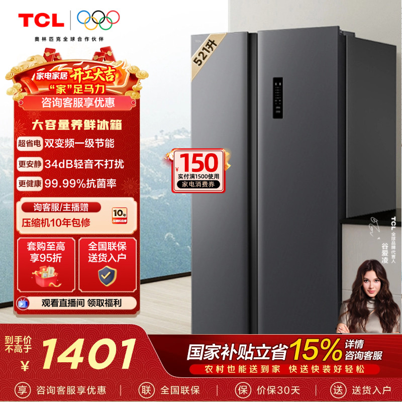 TCL 521升对开门双开门电冰箱大容量63cm超薄风冷无霜家用