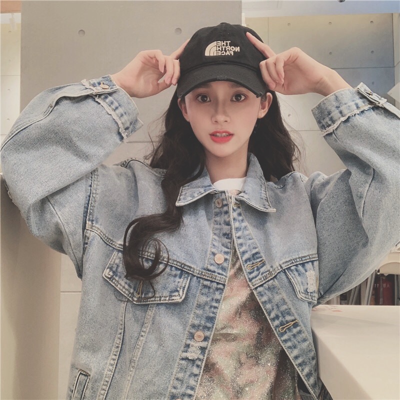 18-7951/H206*牛仔衣外套女M码秋冬港味复古BF风ins潮破洞宽松