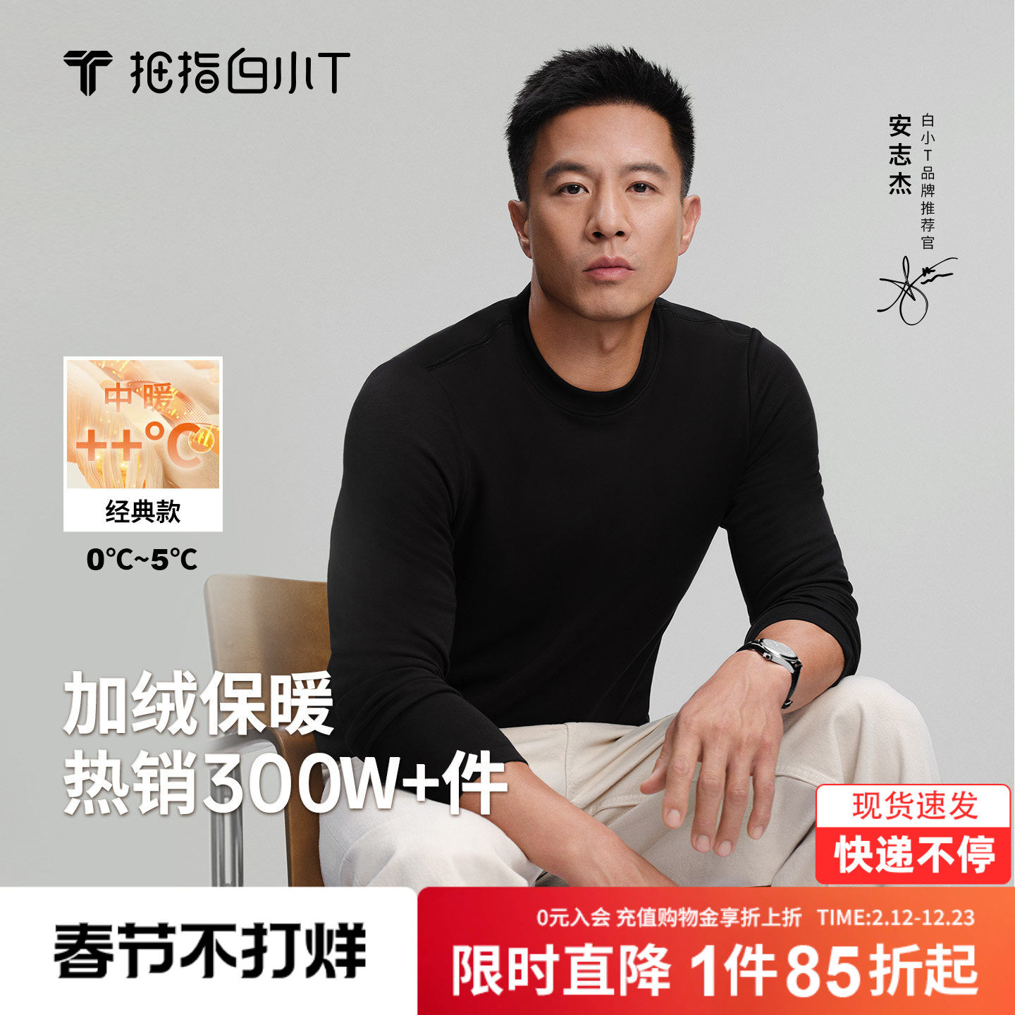 班尼路打底衫男秋冬季双面加绒体恤圆领保暖长袖t恤男款内搭上衣A