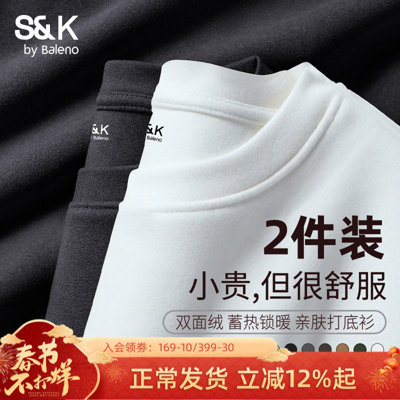 2件装】班尼路S&K加绒长袖t恤男款冬季7A抗菌绒德圆领男士打底衫A