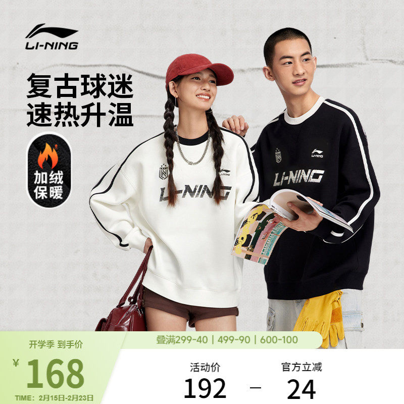 李宁加绒卫衣女冬季新款情侣装长袖圆领加厚保暖上衣男宽松运动服