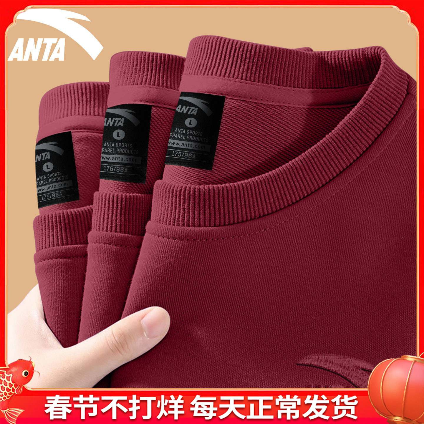 安踏红色加绒卫衣男女秋冬季情侣长袖安可拉红宽松大码圆领打底衫