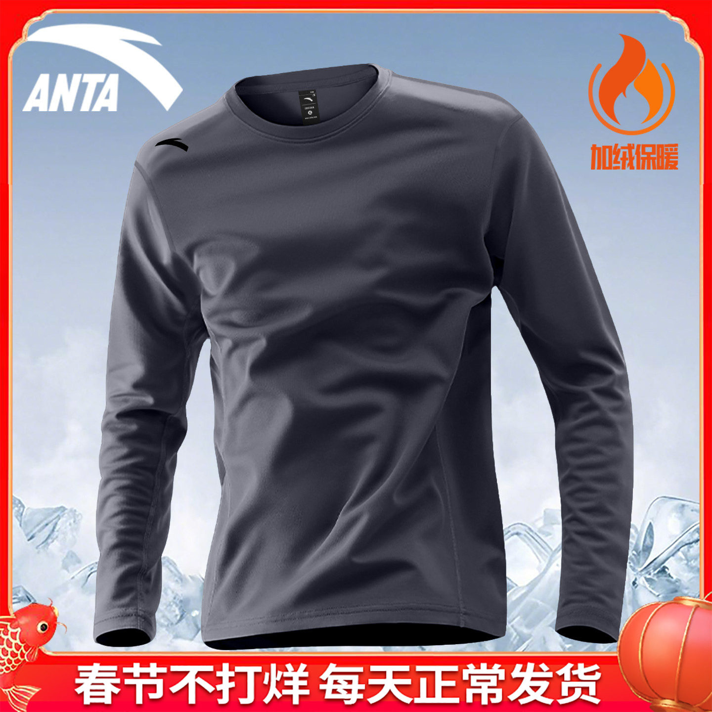 安踏长袖T恤男冬季新款加绒保暖纯色圆领秋衣内搭休闲运动打底衫
