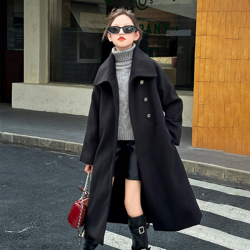 女童简约妮子大衣2025秋装儿童中长款毛呢外套深秋大童红色呢风衣