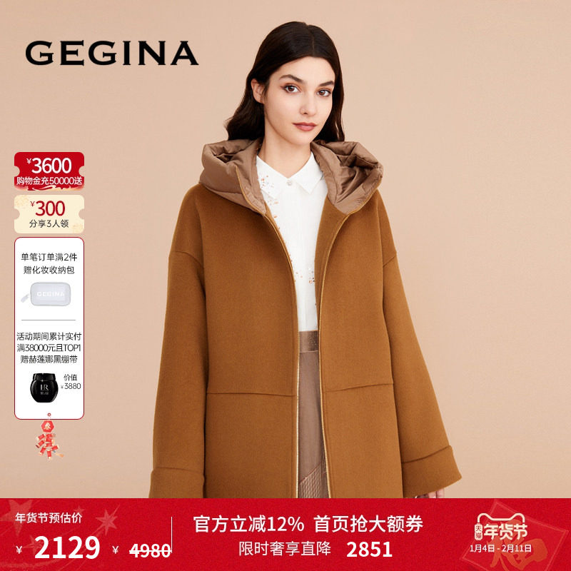 GEGINA吉吉娜新款绵羊毛羊绒混纺妮子大衣连帽纯色保暖复古外套女