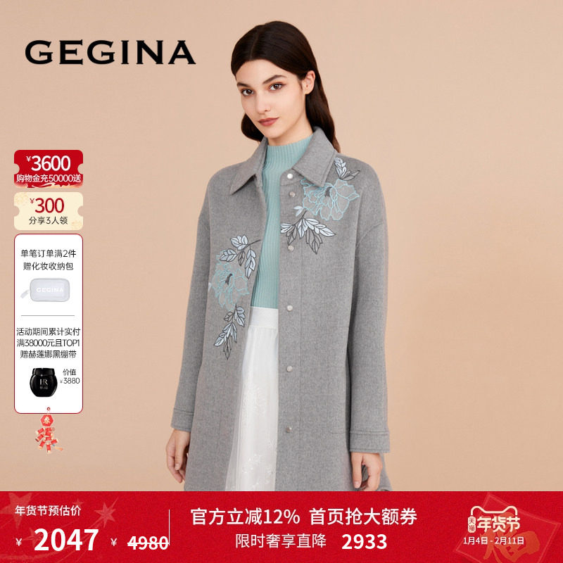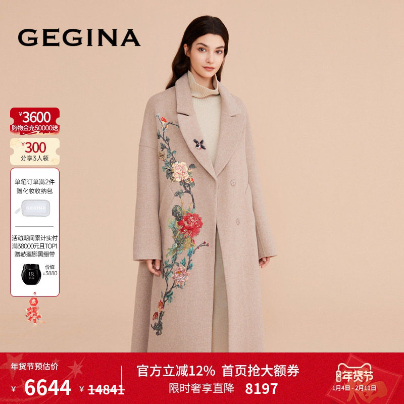 GEGINA吉吉娜新款绵羊毛混纺刺绣妮子大衣女长款过膝高级毛呢外套
