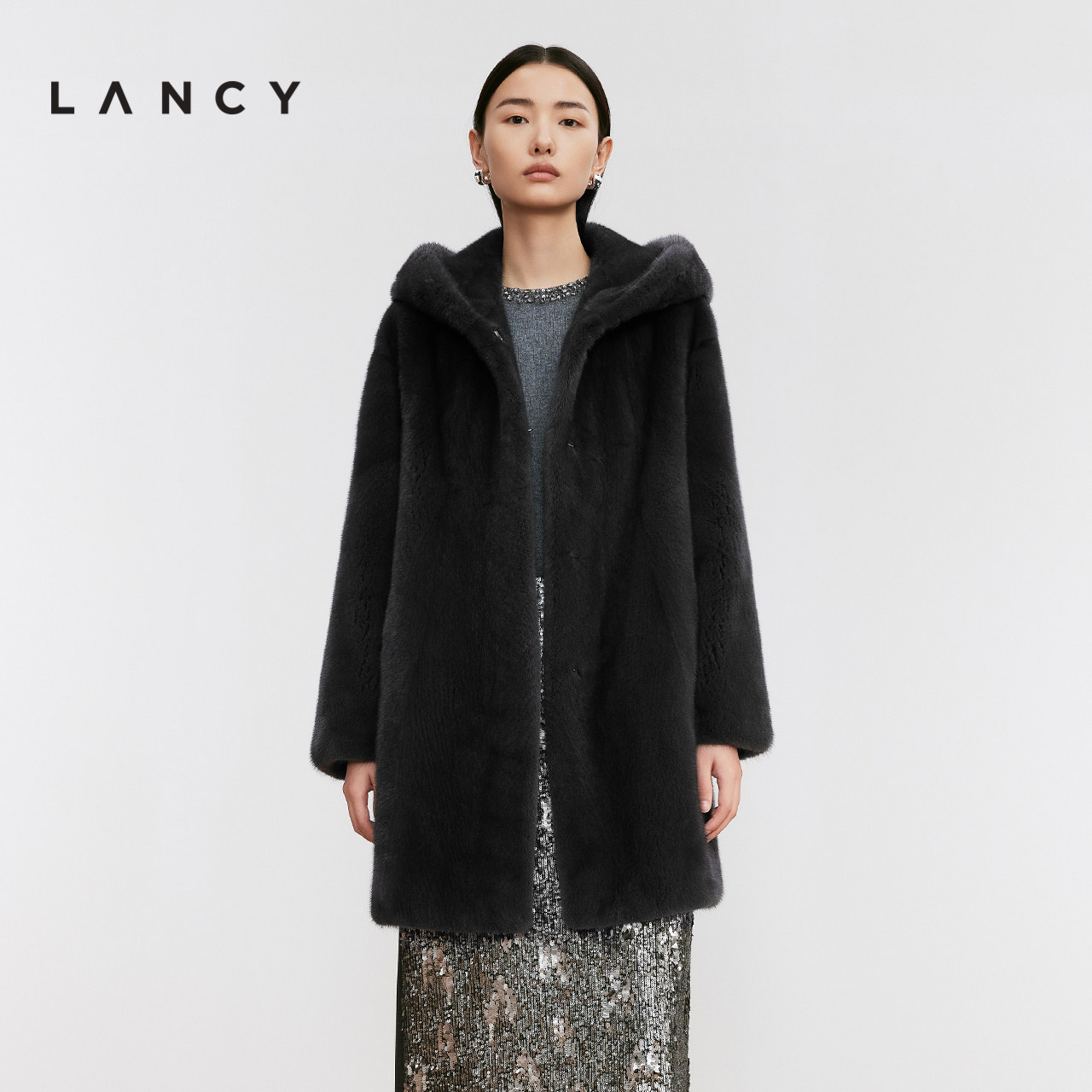 LANCY/朗姿2024冬新款连帽水貂毛中长貂皮大衣女高端气质外套女