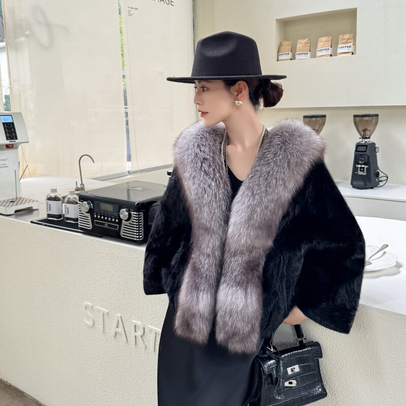小个子高品质进口水貂披肩整貂貂皮大衣女款 狐狸毛皮草斗篷外套