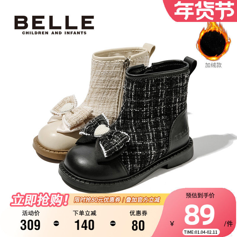 百丽童鞋女童短靴冬季加绒保暖时装靴儿童舒适软底皮靴女孩公主靴