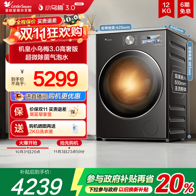 [纯平全嵌] 小天鹅小乌梅3.0家用12KG大容量全自动洗烘一体E40PRO