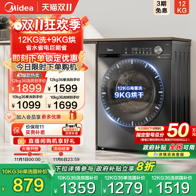 【全民国补】美的12/10kg大容量家用全自动洗脱烘一体滚筒洗衣机