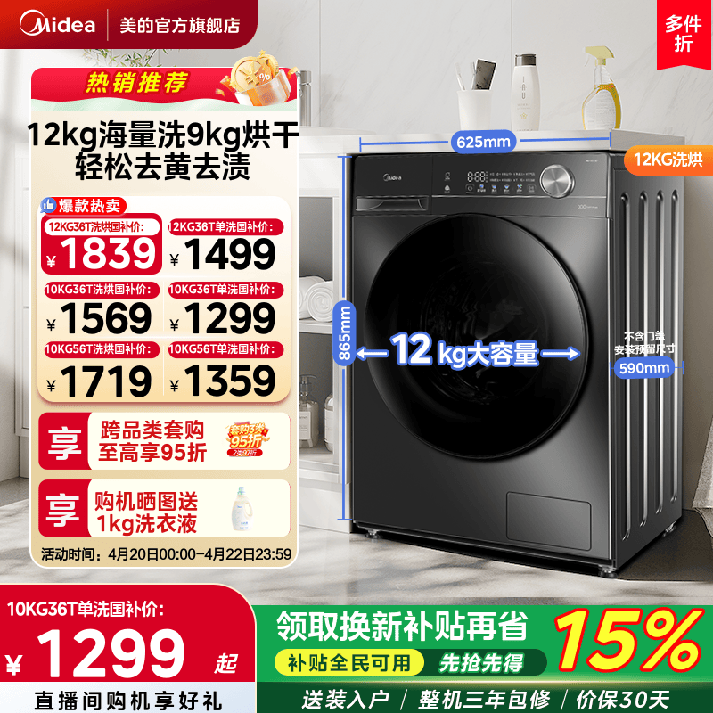 【全民补贴】美的12/10kg大容量家用全自动洗脱烘一体滚筒洗衣机