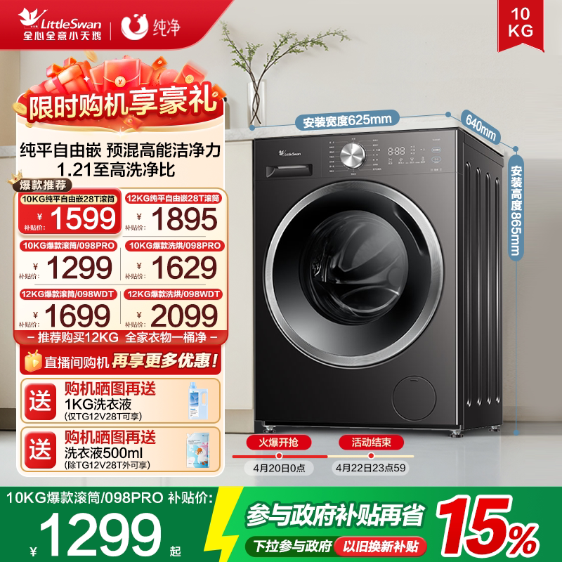 【换新补贴】小天鹅滚筒洗衣机超薄12/10KG家用全自动洗烘一体098