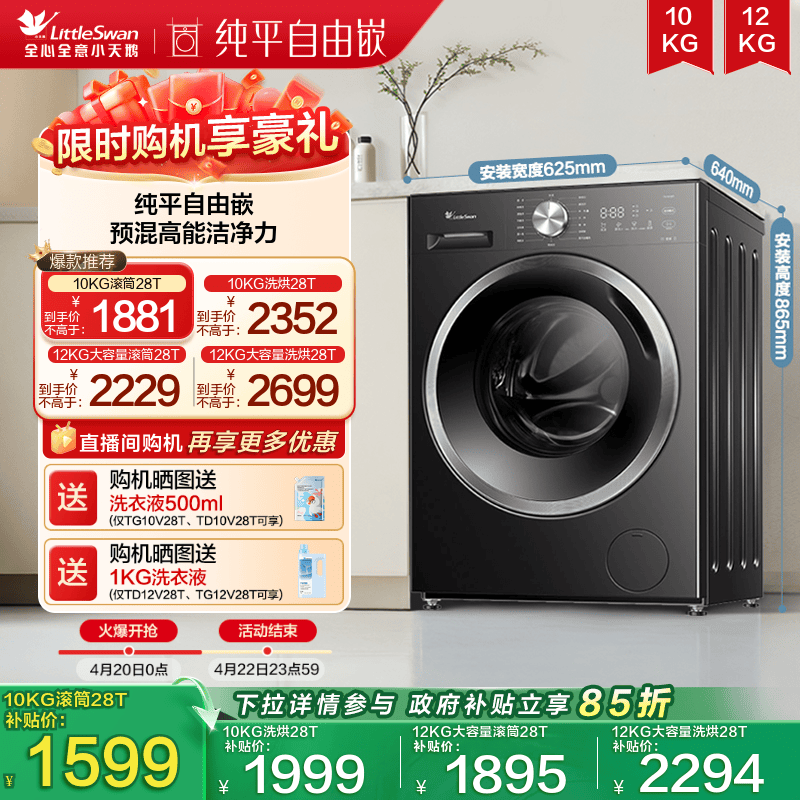 [纯平自由嵌]小天鹅 10/12KG水魔方滚筒洗烘一体洗衣机628PLUS/T