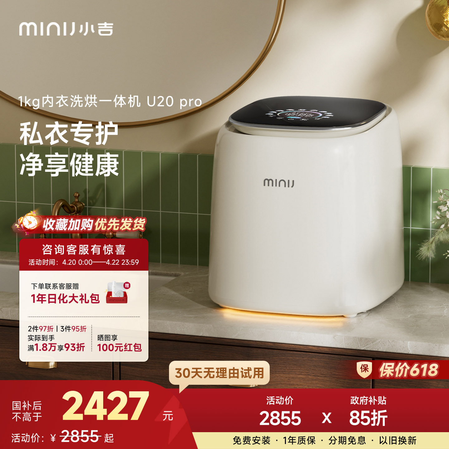 小吉内衣内裤分区洗衣机小型迷你UVC除菌双路智投自清洁洗烘一体