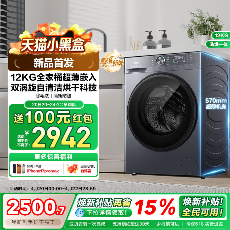 [12kg]海尔小红花滚筒洗衣机家用全自动超大容量超薄洗烘一体52d1