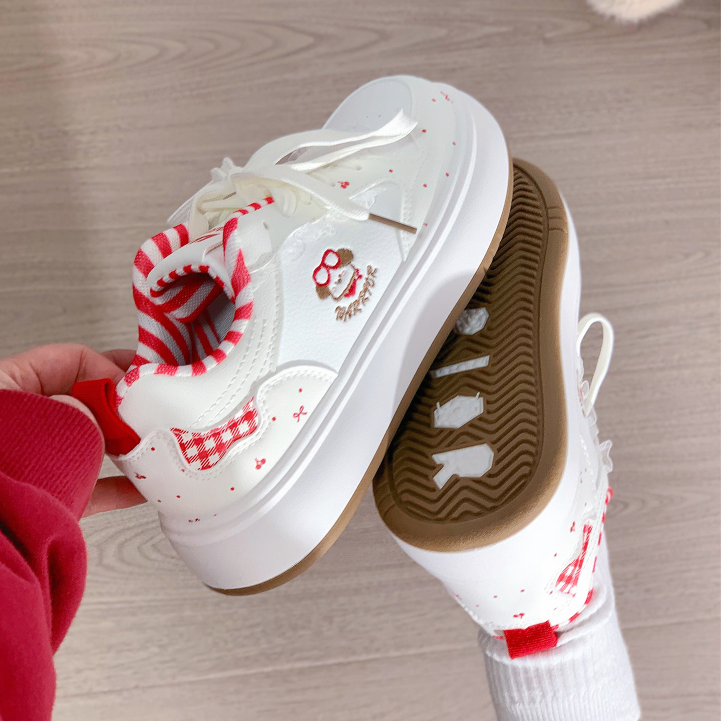 回力酒红格子卡通小白鞋女新款百搭面包鞋子小众原创女鞋厚底板鞋