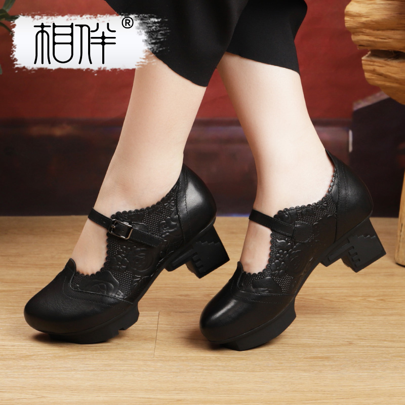 相伴真皮单鞋女2025早秋新款羊皮粗跟皮鞋软底妈妈宫廷风原创女鞋