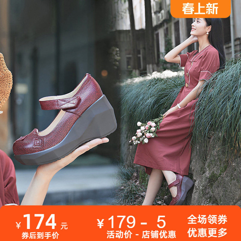 春秋季新款时尚厚底真皮高跟羊皮单鞋女休闲圆头浅口原创女鞋皮鞋