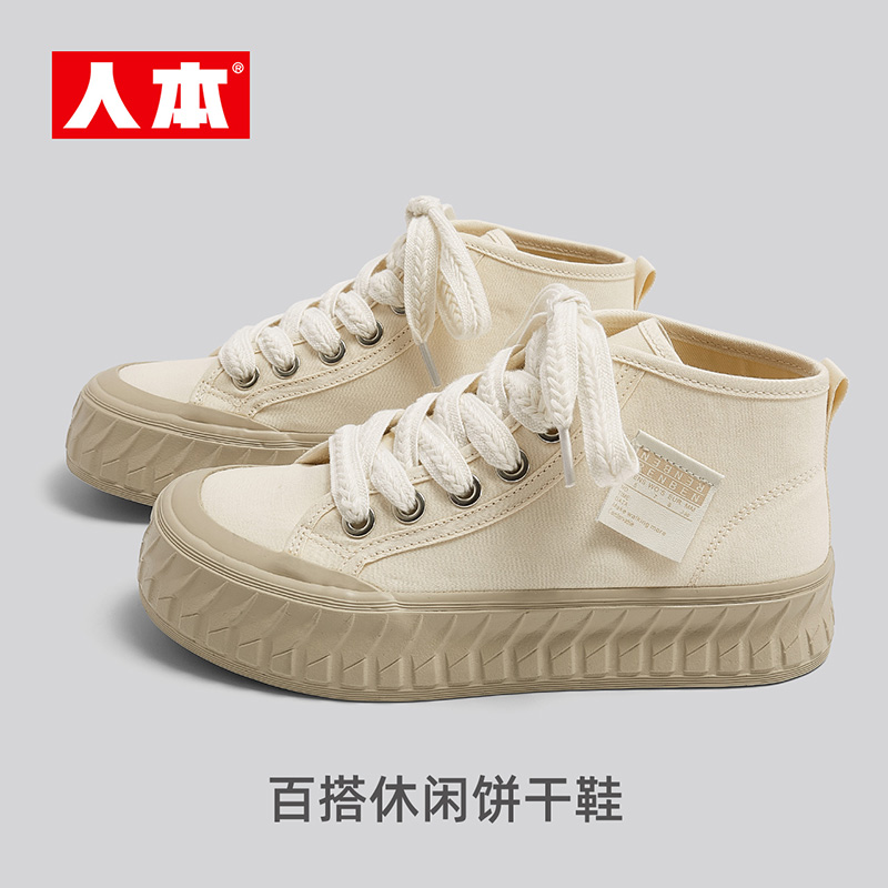 人本官方2025春季新款高帮帆布鞋饼干鞋复古标签板鞋小众原创女鞋