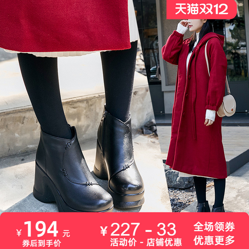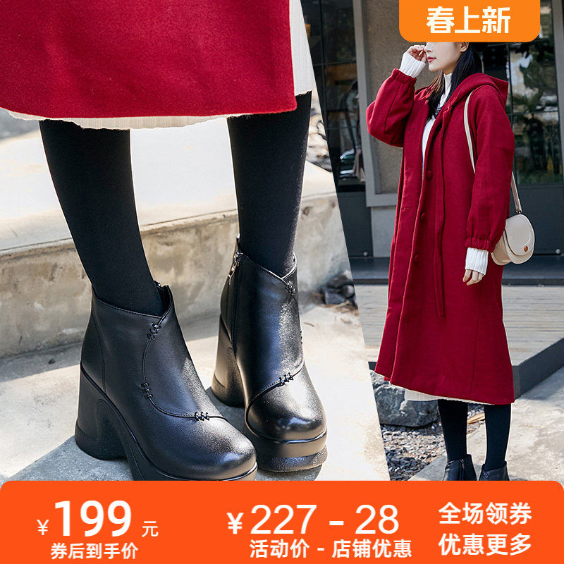 2025秋冬新款坡跟高跟真皮短靴女圆头厚底休闲原创女鞋靴子女靴