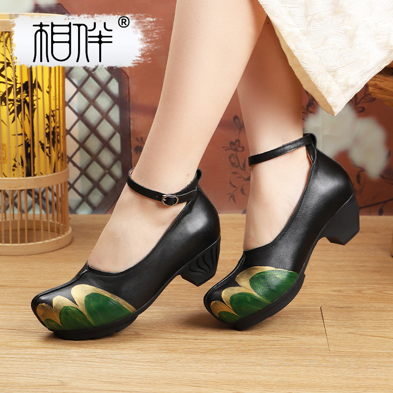 相伴真皮翘头单鞋女2025早秋新款粗跟复古民族风手绘复古原创女鞋