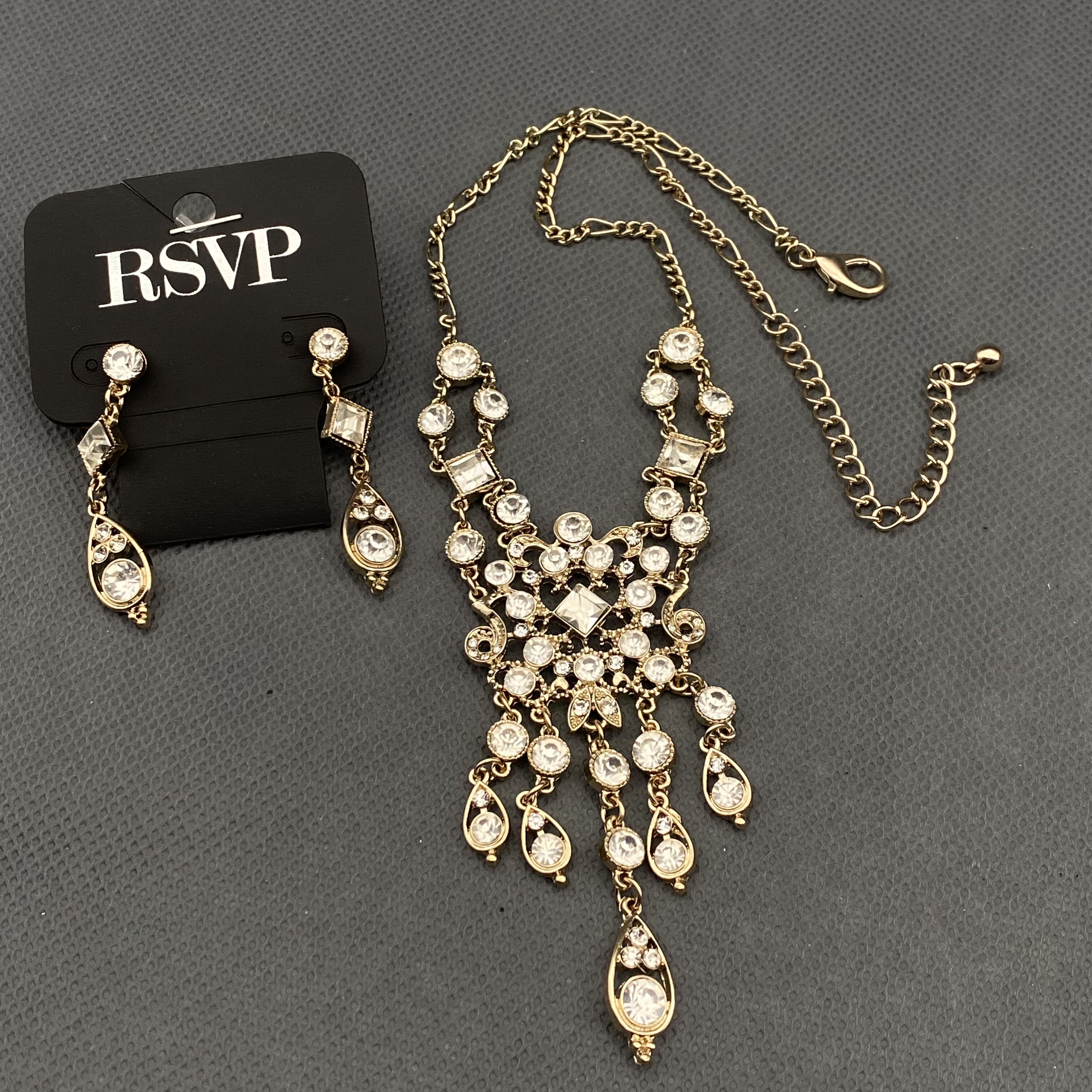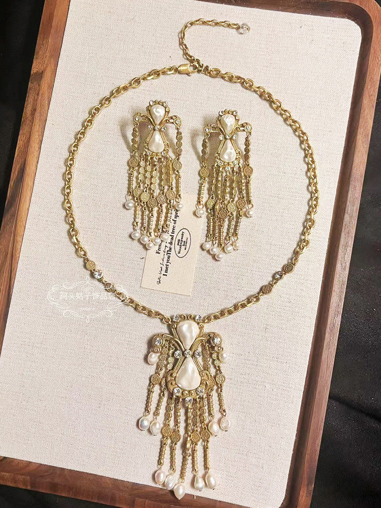 欧美宫廷中古vintage复古铜镀金做旧流苏珍珠闪钻夸张项链耳环女