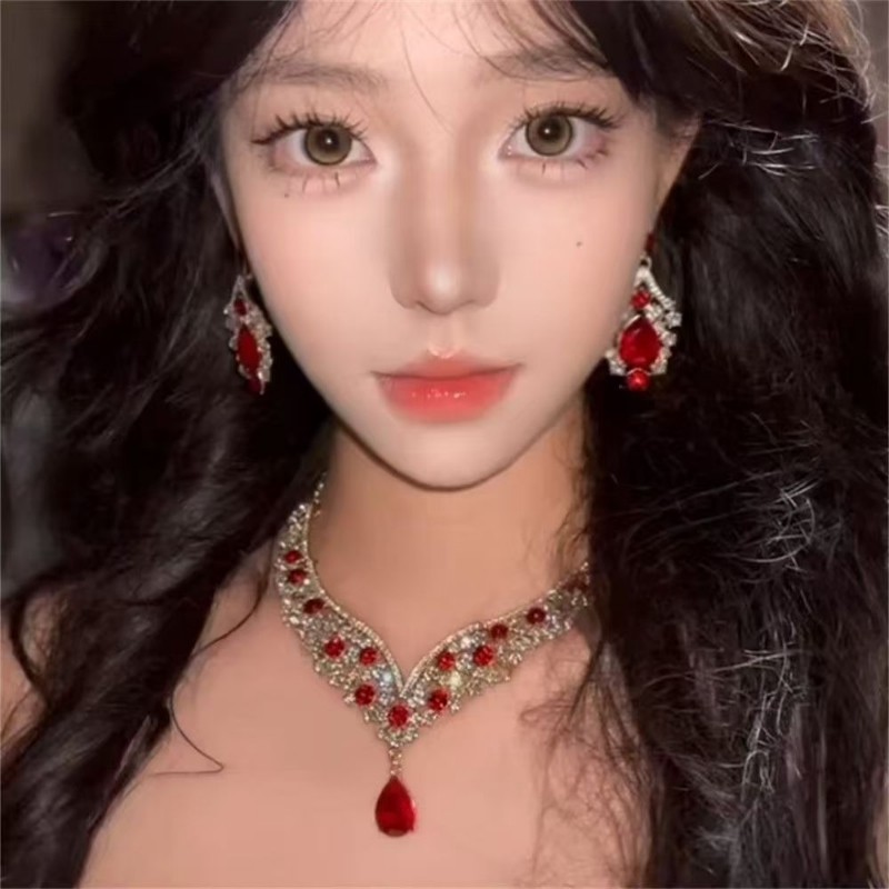 zoozmomo时髦红色夸张项链耳环套装女奢华锆石宴会礼服锁骨链
