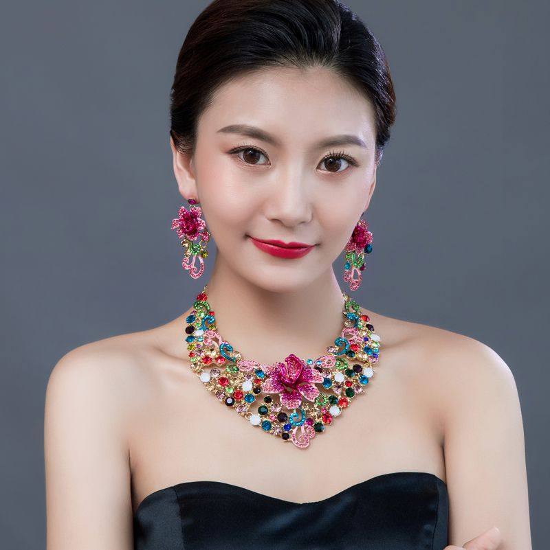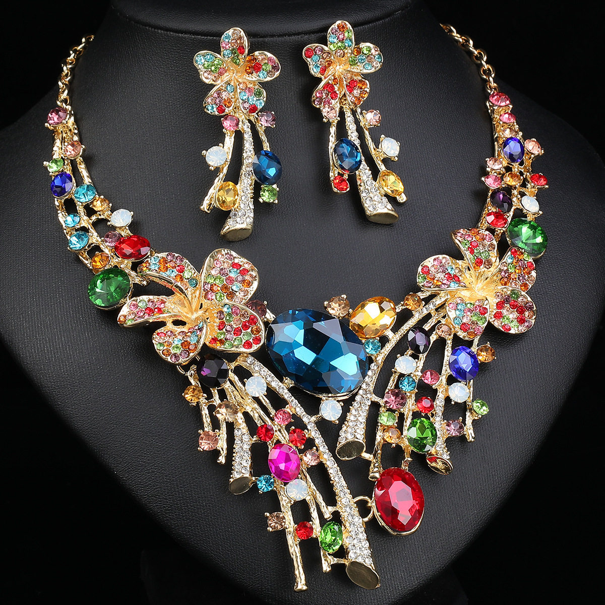 欧美夸张项链耳环套装彩色水晶装饰项链服装配饰流行晚礼服饰品女