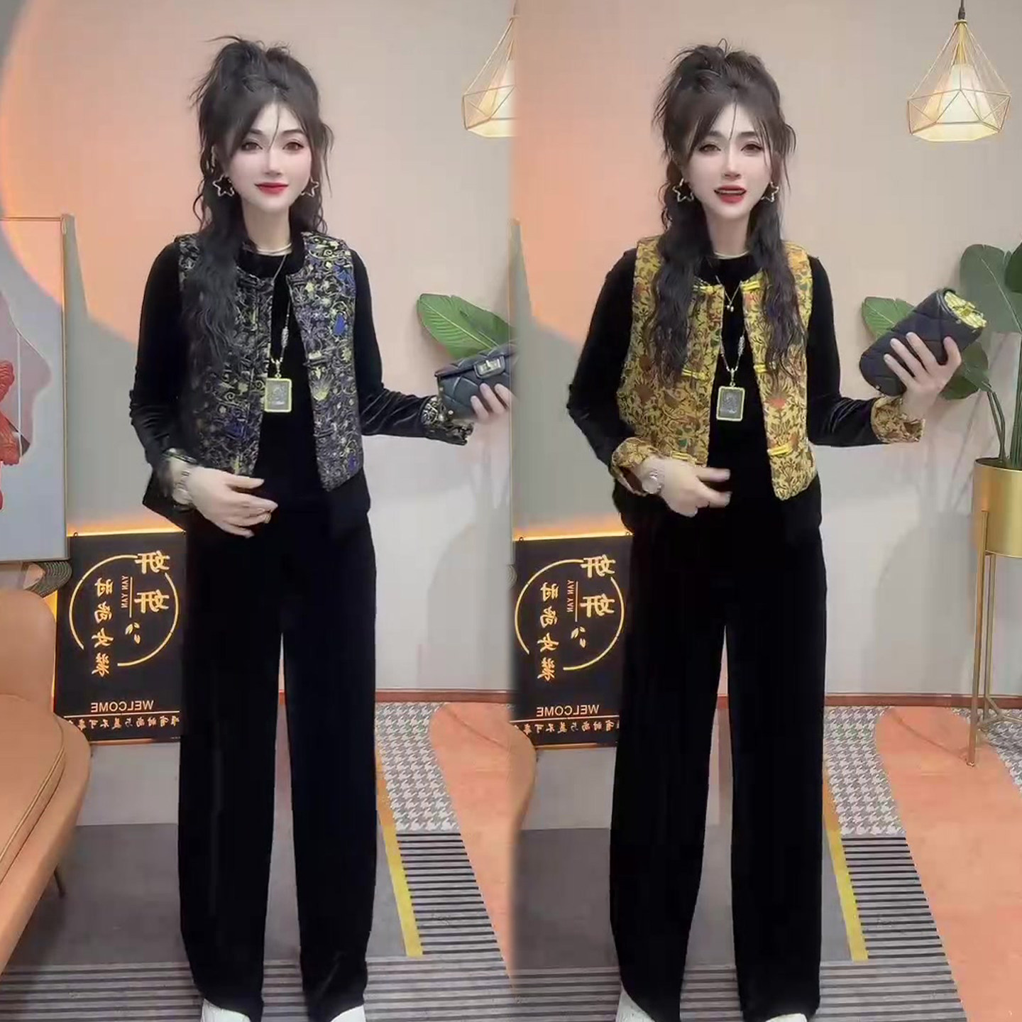 民族风丝绒套装女秋冬新款国风盘扣马甲+拼接款小衫+高腰长裤三件