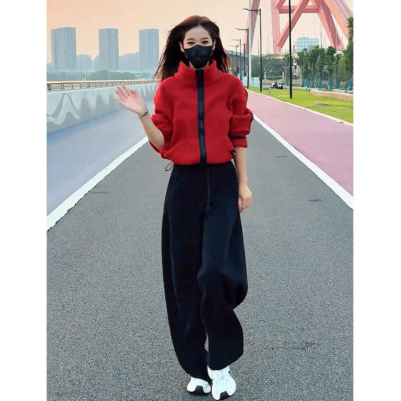 欧洲站运动套装女秋冬加厚2025新款时尚红色外套阔腿裤休闲两件套