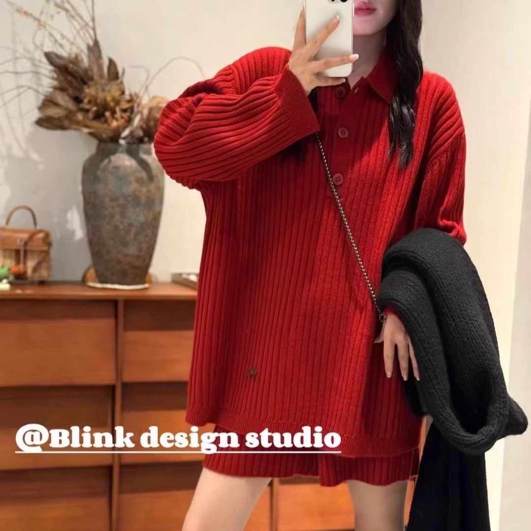 欧洲站2025秋冬新款欧货女休闲POLO领套头羊毛毛衣+针织短裤套装