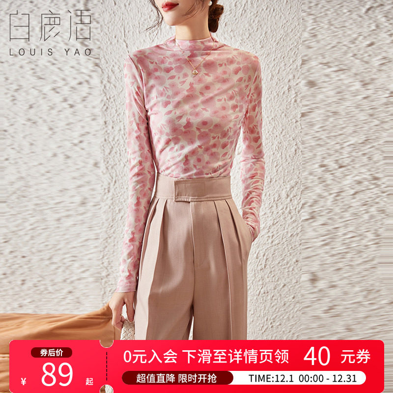 白鹿语堆堆领长袖打底衫春款薄款透肤休闲ins风T恤衫长袖上衣女