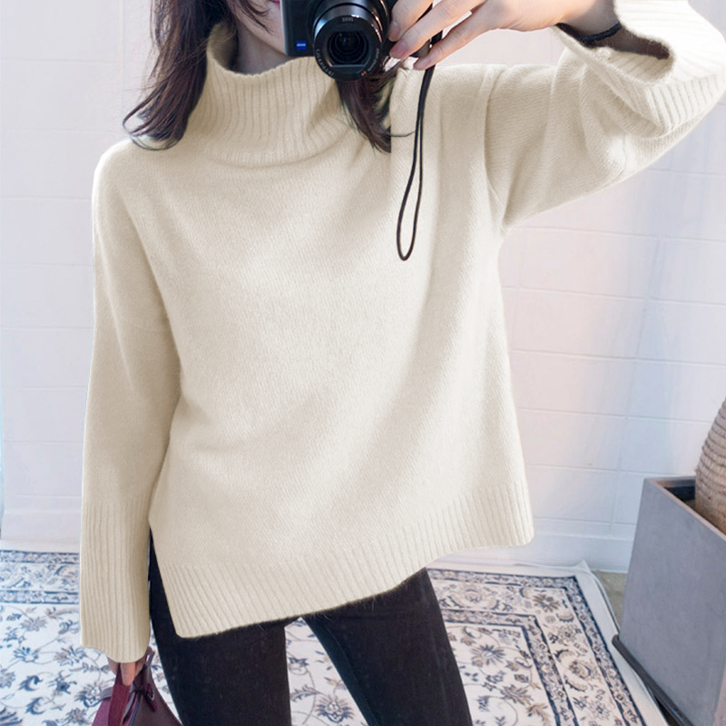 高领毛衣女秋冬新款开叉宽松加厚针织衫百搭显瘦堆堆领长袖打底衫