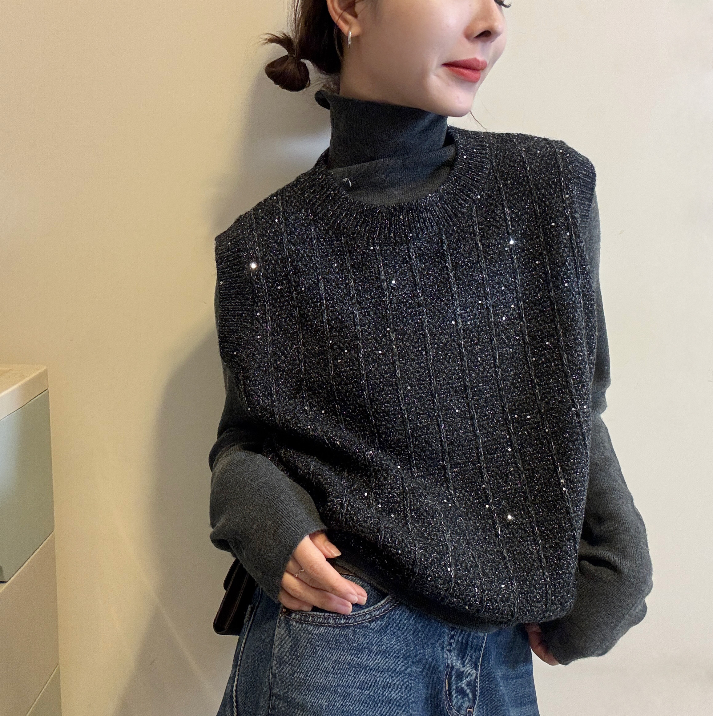 欧洲站2025冬季韩版气质堆堆领长袖打底衫亮片背心两件套针织衫潮