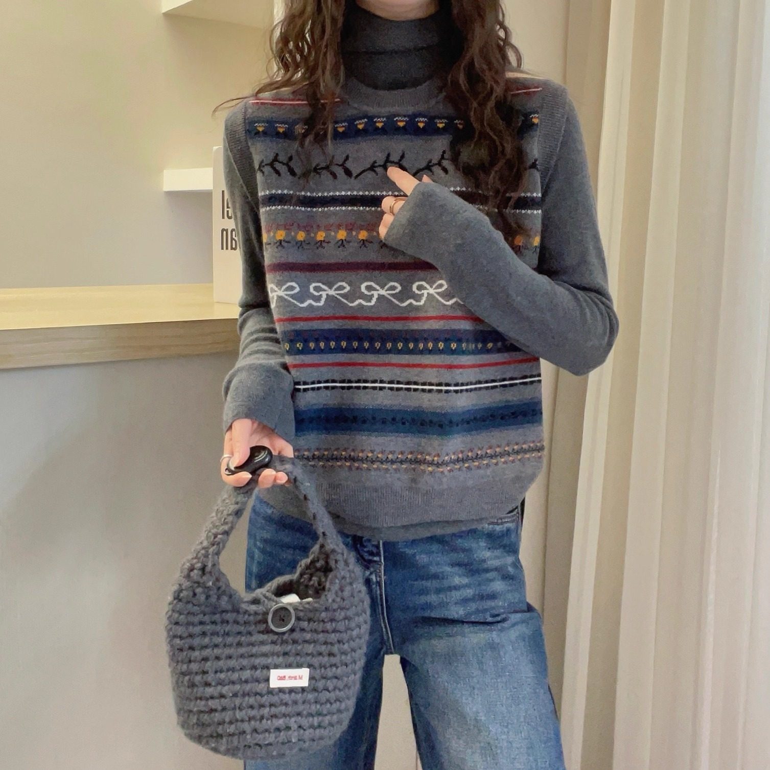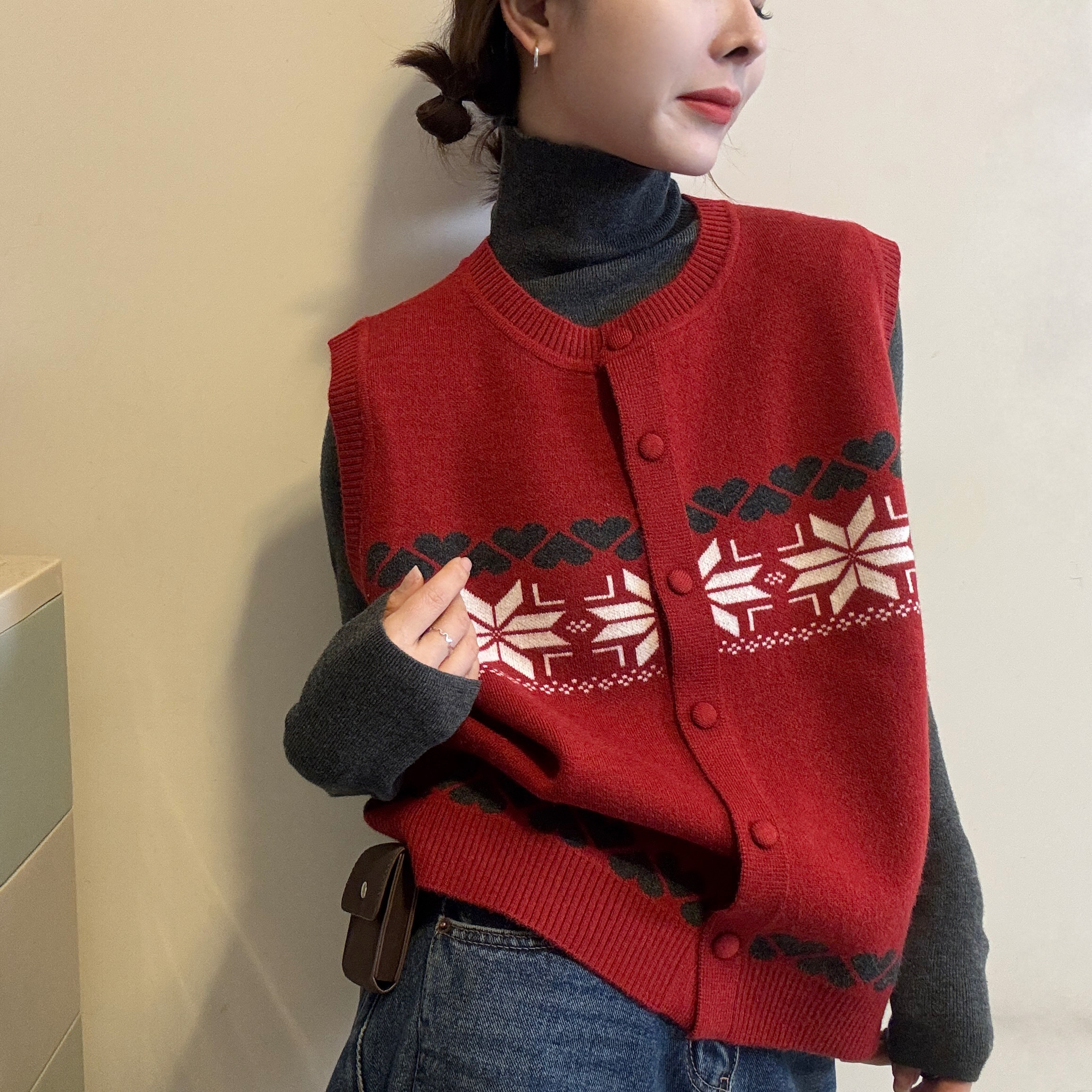 欧洲站2025冬季气质堆堆领长袖打底衫爱心雪花拼色背心针织两件套