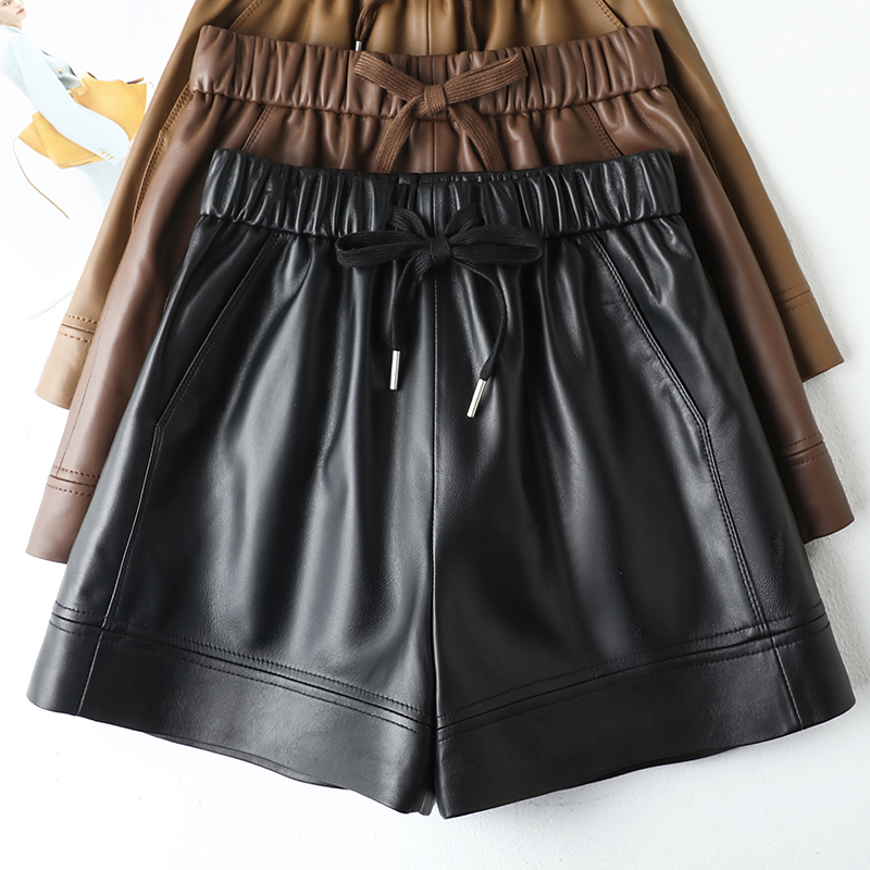 ins秋冬新款绵羊皮皮裤真皮短裤a字松紧高腰宽松显瘦阔腿休闲裤