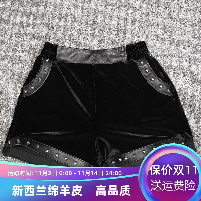 欧洲站2025秋季新款真皮短裤女绵羊皮拼金丝绒短裤子热裤松紧腰