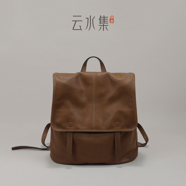 云水集真皮女包植鞣羊皮复古双肩包竖款上班通勤大容量休闲背包软