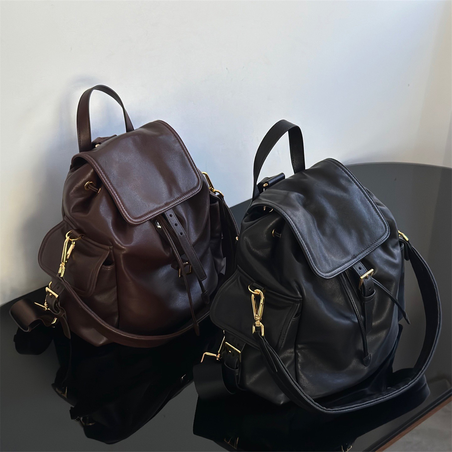 提拉米苏原创女包新款咖啡色羊皮双肩包复古简约学院风单肩斜跨包