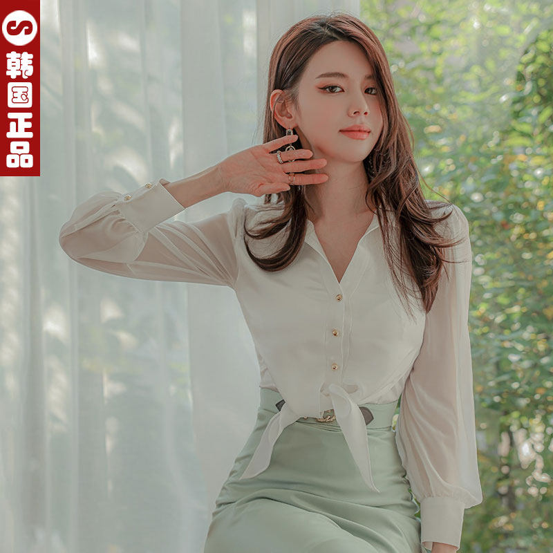 韩国代购女装透明衬衫长袖韩版薄纱雪纺衬衣性感洋气名媛气质上衣