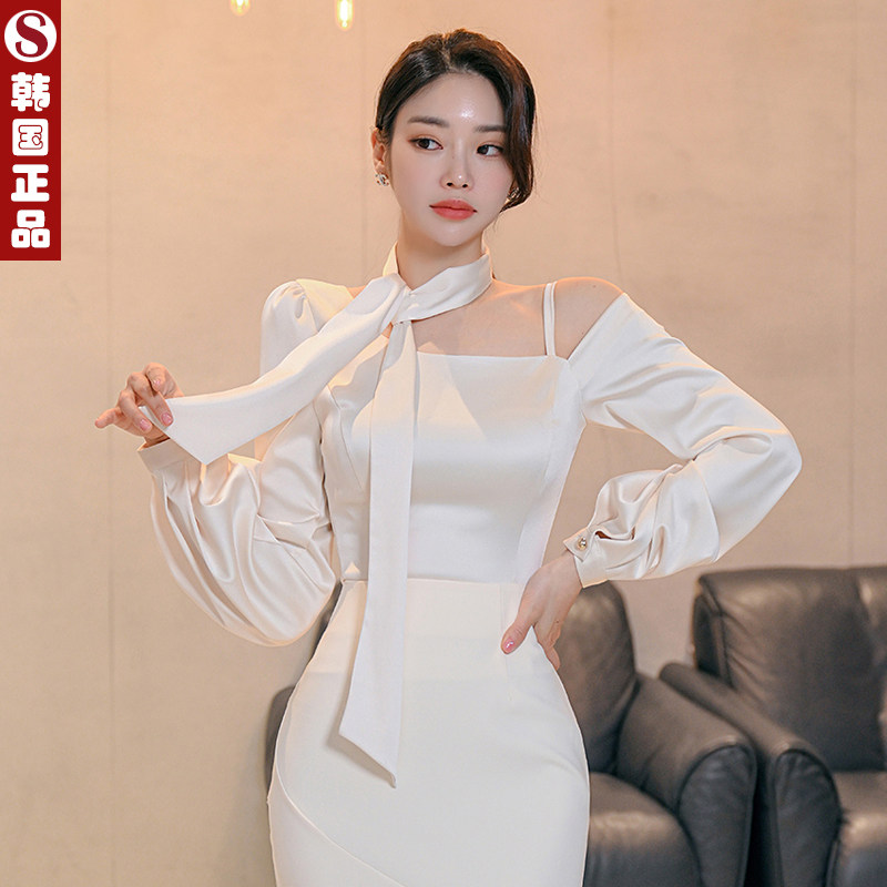 韩国代购高端女装性感露肩绸缎面衬衫上衣修身长袖女人味时尚气质