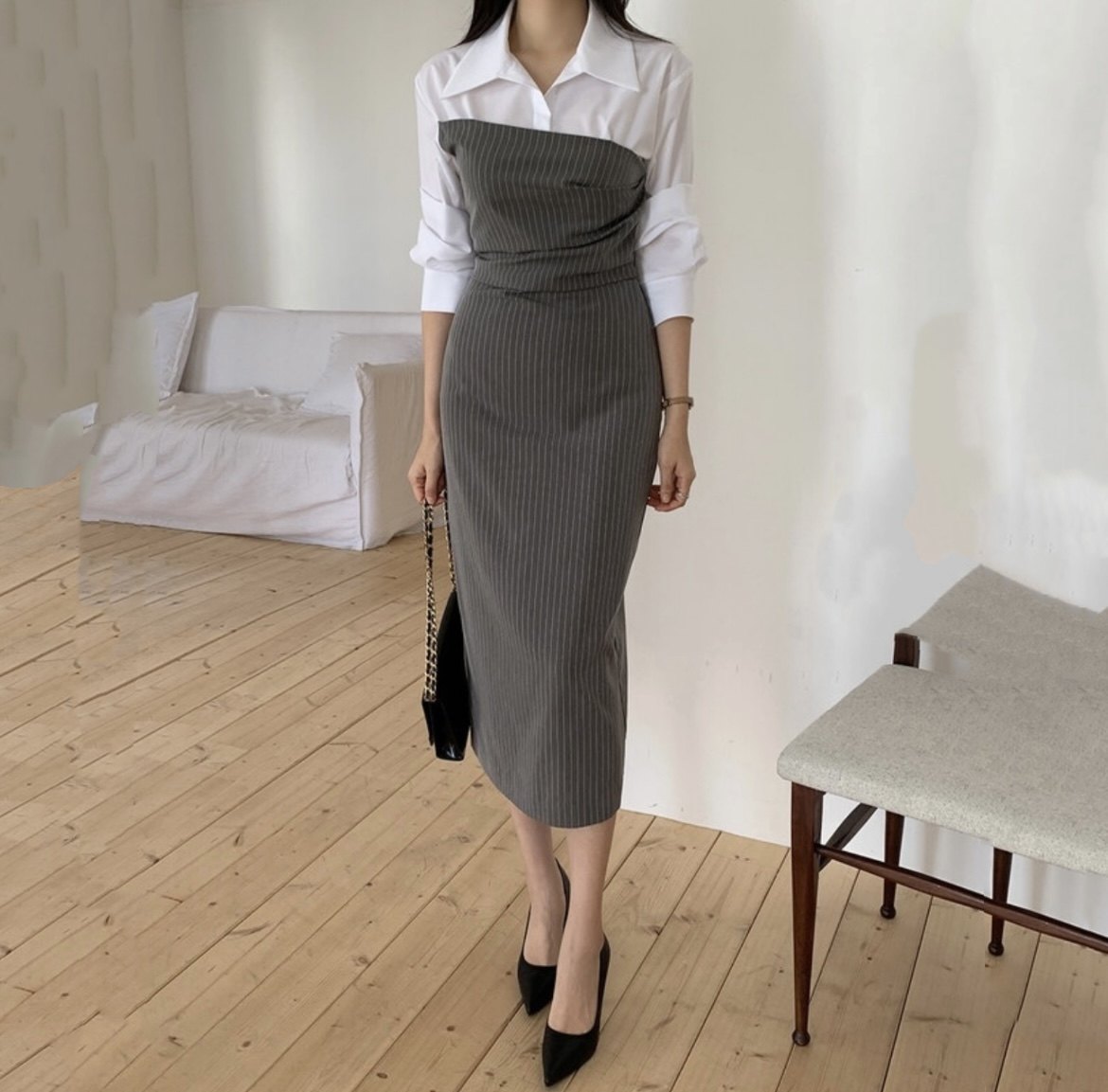 辛子韩国代购连衣裙翻领小心机衬衫性感包臀连衣裙长袖假两件裙子